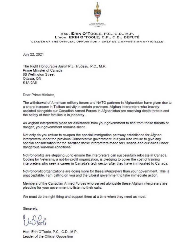 Erin O Toole On Twitter On July 22 I Wrote To The Prime Minister About The Crisis About To Explode In Afghanistan